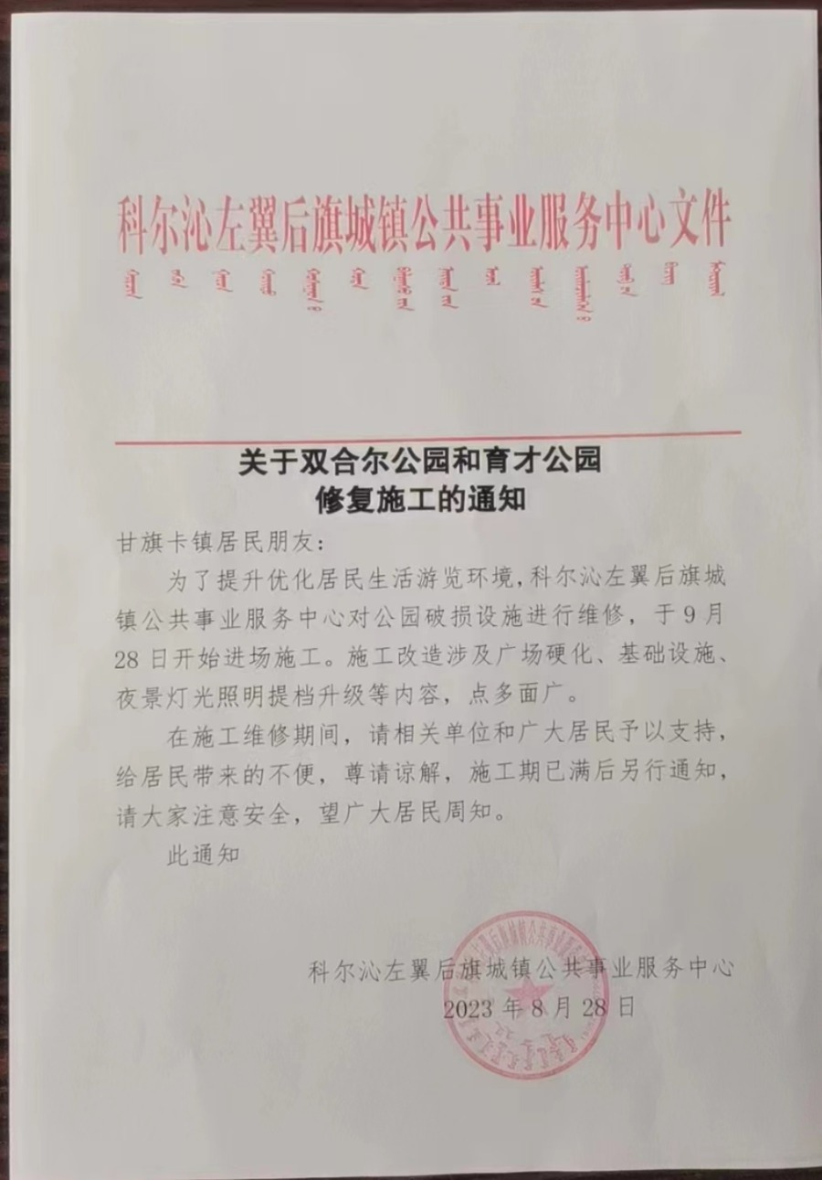 關于雙合爾公園(yuan)和育才公園(yuan)修復(fu)施工的通知(zhi)