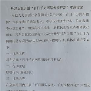 科左后旗開(kai)展(zhan)(zhan)“百日千(qian)萬網絡(luo)專項行(xing)動”的通(tong)知(zhi)根據人力資源社(she)會保(bao)障(zhang)部?關于開(kai)展(zhan)(zhan)“百日千(qian)萬網絡(luo)招聘”專項行(xing)動?的通(tong)知(zhi)要求(qiu)。積極應對疫情(qing)沖擊,推(tui)動我旗企(qi)業復工復產,加強高(gao)校(xiao)畢業生、農牧民工等重(zhong)點群體(ti)就業服務,